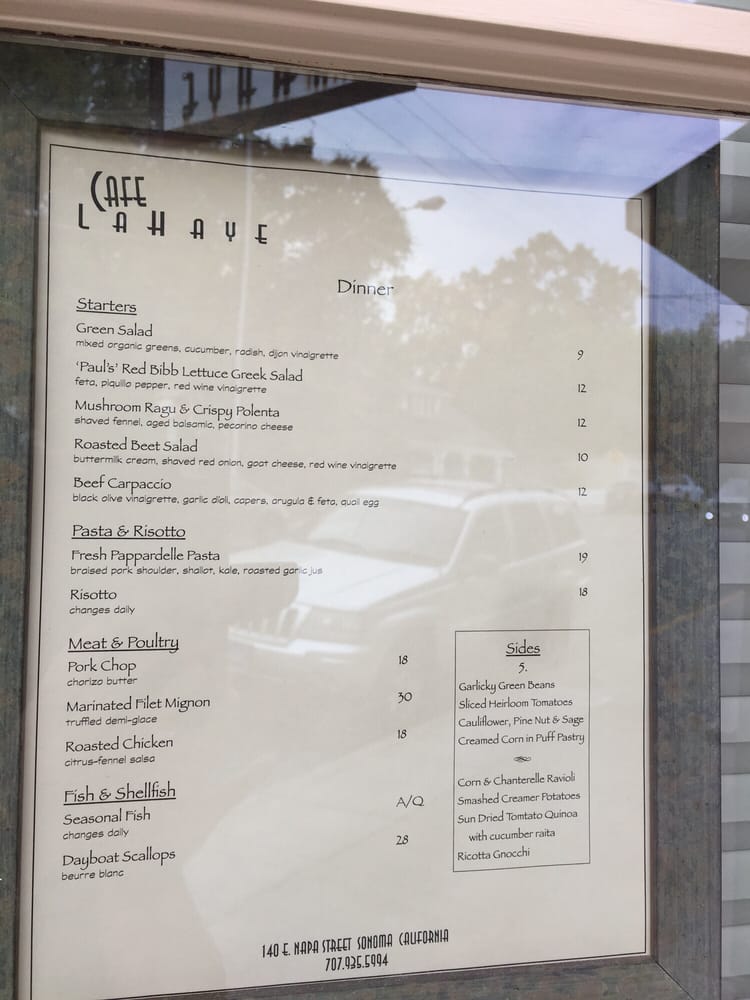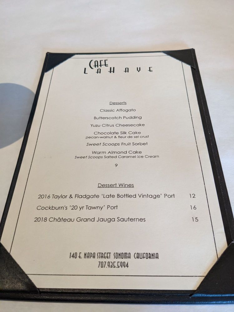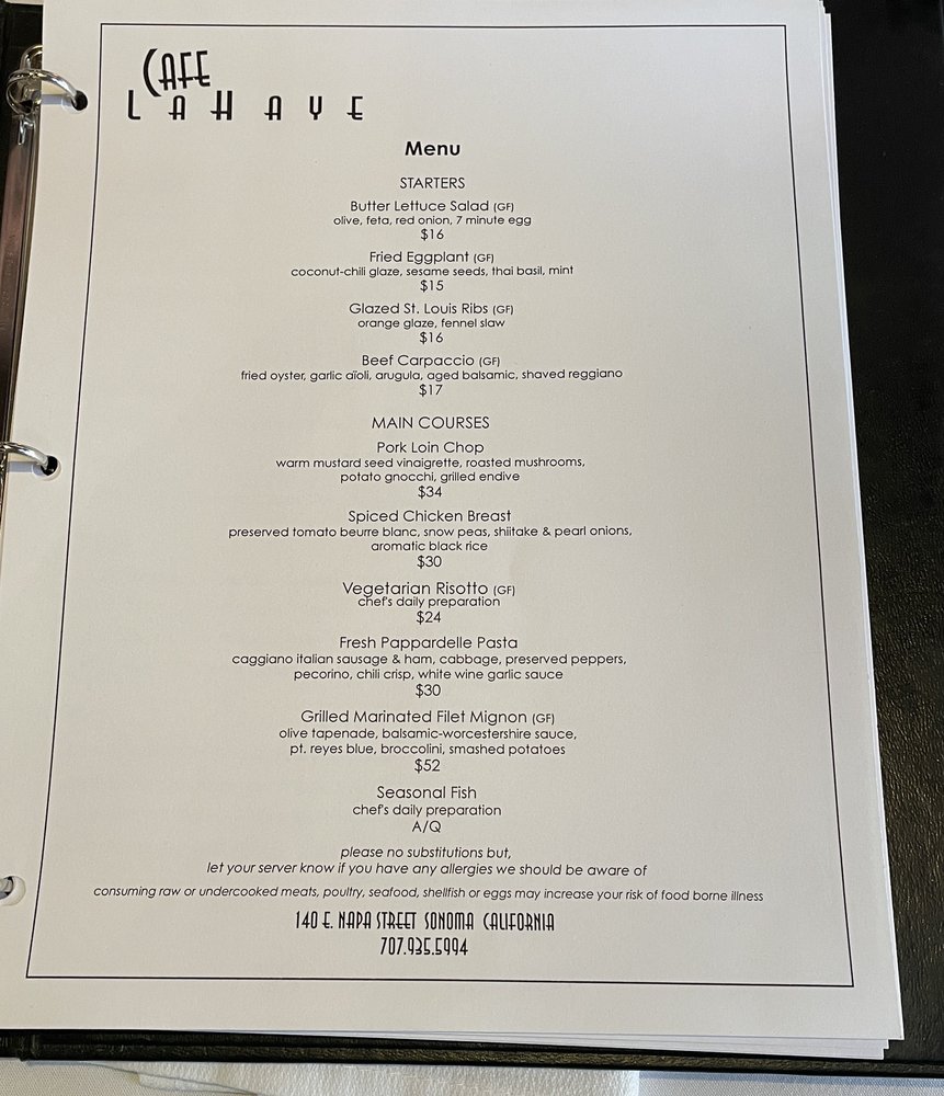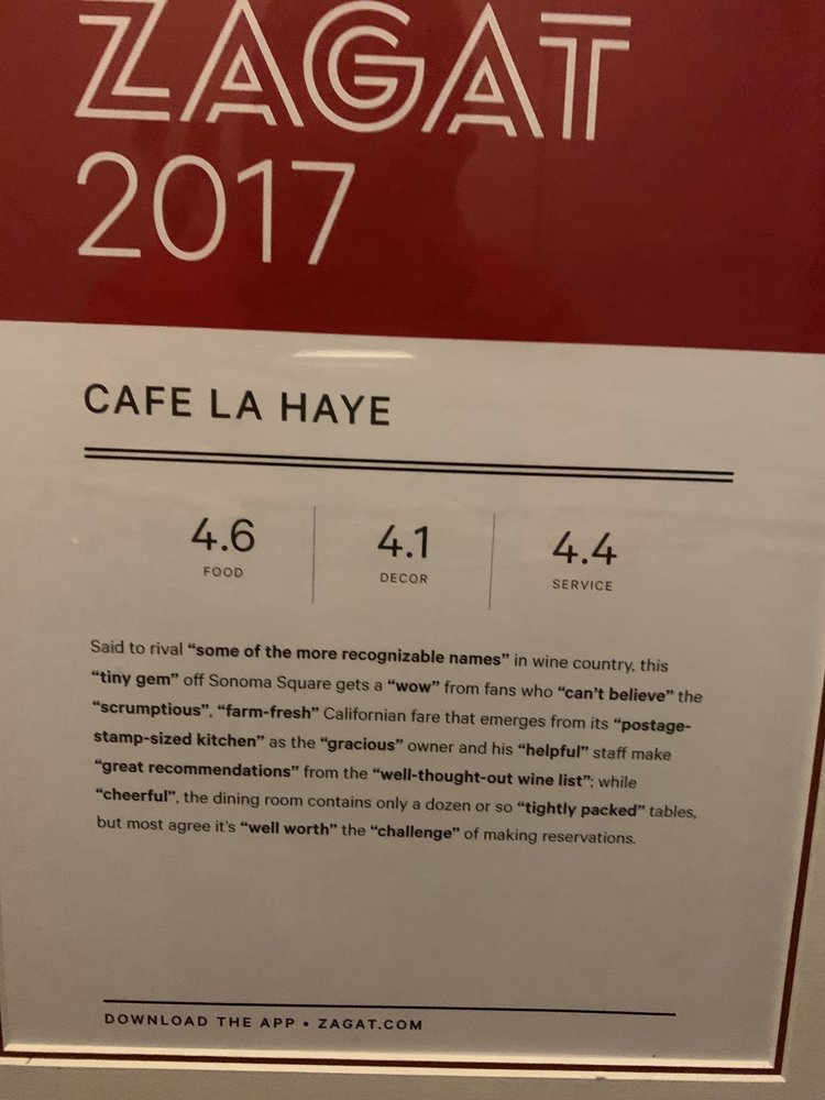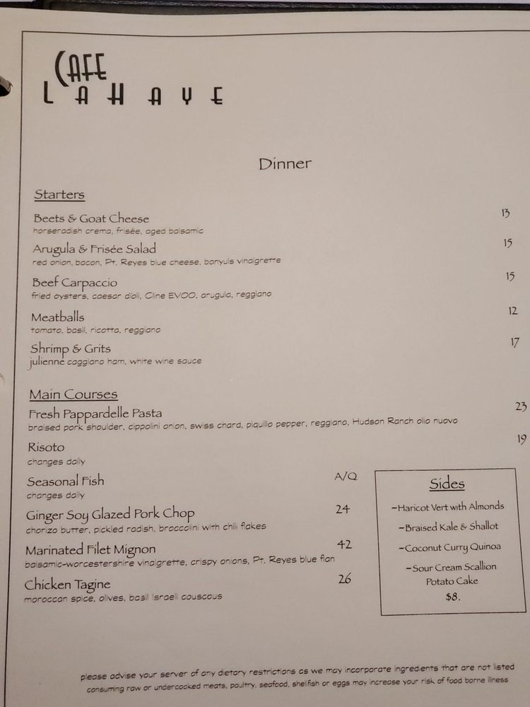 Cafe La Haye in Sonoma offers a delightful dining experience with a menu focused on New American cuisine. With options for vegan and limited vegetarian diets, the restaurant prides itself on using locally sourced ingredients creatively prepared. The intimate and classy ambiance sets the stage for top-tier dishes like the risotto, tagliarini pasta, and marinated filet mignon. Desserts like the yuzu cheesecake and seasonal fruit crisp are must-tries. The attentive service and generous portions add to the overall exceptional dining experience. Reviews rave about the friendly staff, standout dishes, and cozy atmosphere. Whether it's a special occasion or a casual night out, Cafe La Haye is a gem worth visiting.